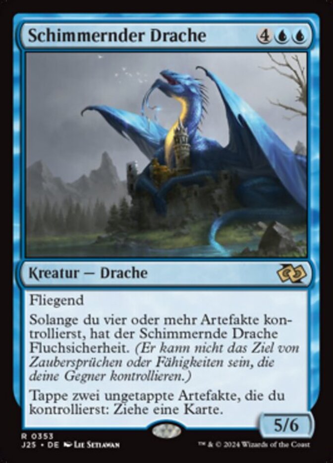 | Rules | Flying As long as you control four or more artifacts, Shimmer Dragon has hexproof. Tap two untapped artifacts you control: Draw a card. |