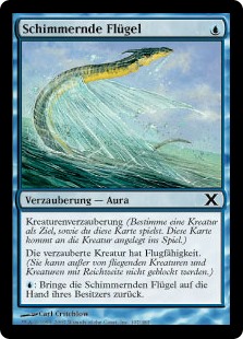 | Rules | Enchant creature (Target a creature as you cast this. This card enters the battlefield attached to that creature.) Enchanted creature has flying. (It can't be blocked except by creatures with flying or reach.) : Return Shimmering Wings to its owner's hand. |