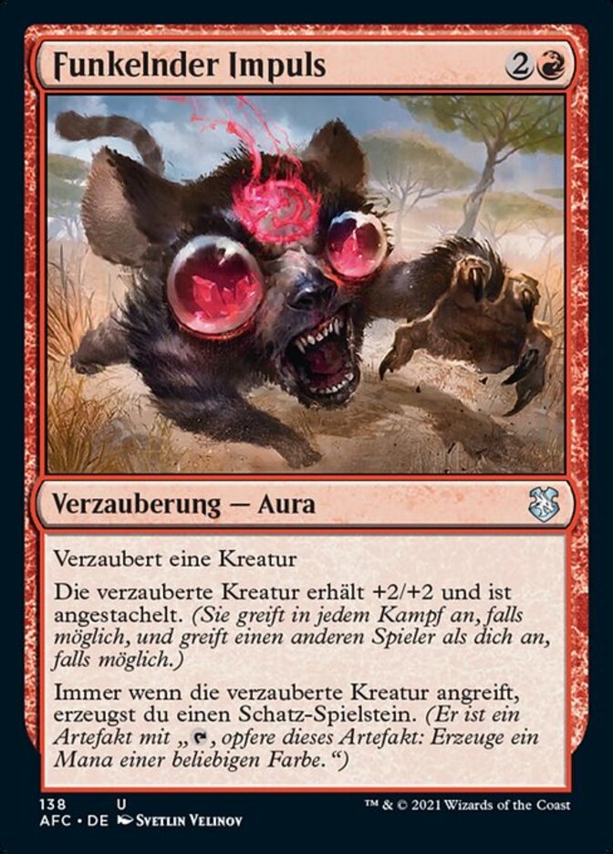 | Rules | Enchant creature Enchanted creature gets +2/+2 and is goaded. (It attacks each combat if able and attacks a player other than you if able.) Whenever enchanted creature attacks, you create a Treasure token. (It's an artifact with ", Sacrifice this artifact: Add one mana of any color.") |