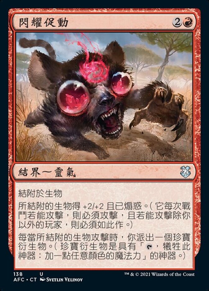 | Rules | Enchant creature Enchanted creature gets +2/+2 and is goaded. (It attacks each combat if able and attacks a player other than you if able.) Whenever enchanted creature attacks, you create a Treasure token. (It's an artifact with ", Sacrifice this artifact: Add one mana of any color.") |