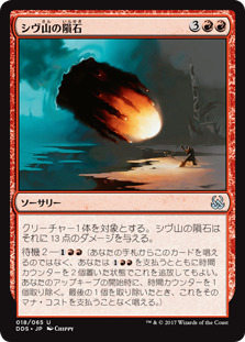 | Rules | Shivan Meteor deals 13 damage to target creature. Suspend 2— (Rather than cast this card from your hand, you may pay and exile it with two time counters on it. At the beginning of your upkeep, remove a time counter. When the last is removed, cast it without paying its mana cost.) |