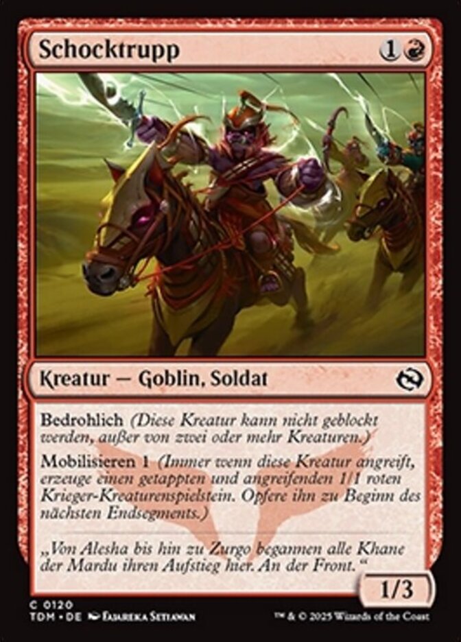 | Rules | Menace (This creature can't be blocked except by two or more creatures.) Mobilize 1 (Whenever this creature attacks, create a tapped and attacking 1/1 red Warrior creature token. Sacrifice it at the beginning of the next end step.) |