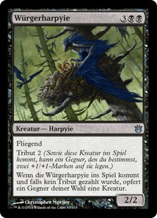 | Rules | Flying Tribute 2 (As this creature enters the battlefield, an opponent of your choice may put two +1/+1 counters on it.) When Shrike Harpy enters the battlefield, if tribute wasn't paid, target opponent sacrifices a creature. |