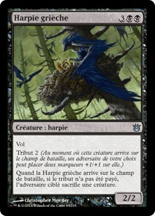 | Rules | Flying Tribute 2 (As this creature enters the battlefield, an opponent of your choice may put two +1/+1 counters on it.) When Shrike Harpy enters the battlefield, if tribute wasn't paid, target opponent sacrifices a creature. |