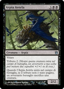 | Rules | Flying Tribute 2 (As this creature enters the battlefield, an opponent of your choice may put two +1/+1 counters on it.) When Shrike Harpy enters the battlefield, if tribute wasn't paid, target opponent sacrifices a creature. |