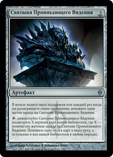 | Rules | At the beginning of your upkeep or whenever you cast a blue spell, put a charge counter on Shrine of Piercing Vision. , Sacrifice Shrine of Piercing Vision: Look at the top X cards of your library, where X is the number of charge counters on Shrine of Piercing Vision. Put one of those cards into your hand and the rest on the bottom of your library in any order. |