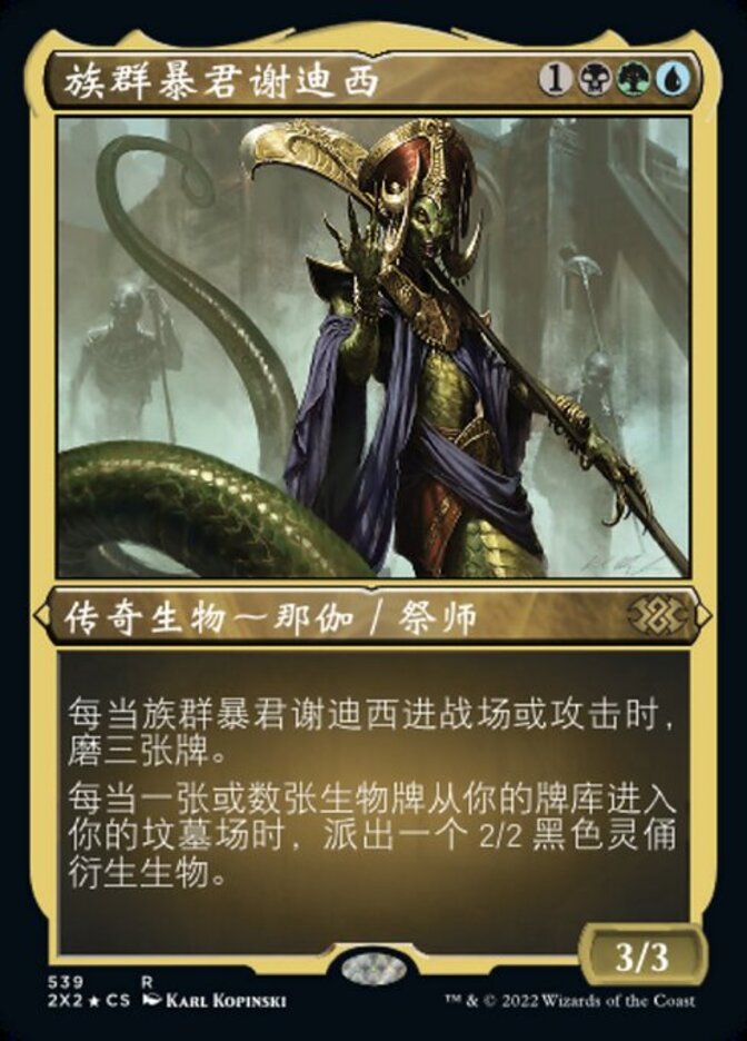 | Rules | Whenever Sidisi, Brood Tyrant enters the battlefield or attacks, mill three cards. Whenever one or more creature cards are put into your graveyard from your library, create a 2/2 black Zombie creature token. |