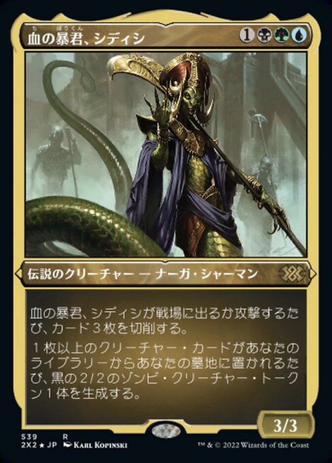 | Rules | Whenever Sidisi, Brood Tyrant enters the battlefield or attacks, mill three cards. Whenever one or more creature cards are put into your graveyard from your library, create a 2/2 black Zombie creature token. |