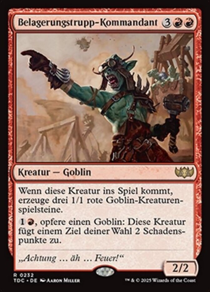 | Rules | When Siege-Gang Commander enters the battlefield, create three 1/1 red Goblin creature tokens. , Sacrifice a Goblin: Siege-Gang Commander deals 2 damage to any target. |