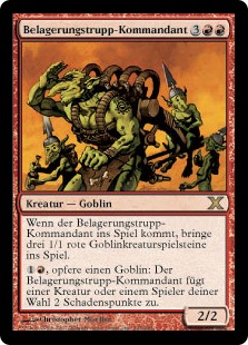 | Rules | When Siege-Gang Commander enters the battlefield, create three 1/1 red Goblin creature tokens. , Sacrifice a Goblin: Siege-Gang Commander deals 2 damage to any target. |