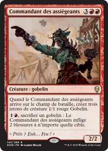 | Rules | When Siege-Gang Commander enters the battlefield, create three 1/1 red Goblin creature tokens. , Sacrifice a Goblin: Siege-Gang Commander deals 2 damage to any target. |