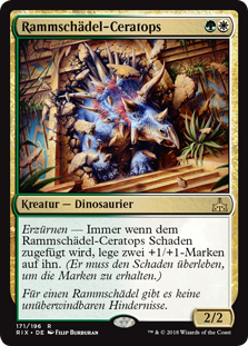 | Rules | Enrage — Whenever Siegehorn Ceratops is dealt damage, put two +1/+1 counters on it. (It must survive the damage to get the counters.) |