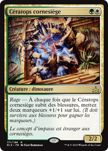 | Rules | Enrage — Whenever Siegehorn Ceratops is dealt damage, put two +1/+1 counters on it. (It must survive the damage to get the counters.) |