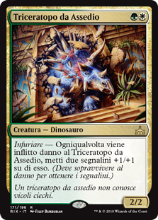 | Rules | Enrage — Whenever Siegehorn Ceratops is dealt damage, put two +1/+1 counters on it. (It must survive the damage to get the counters.) |
