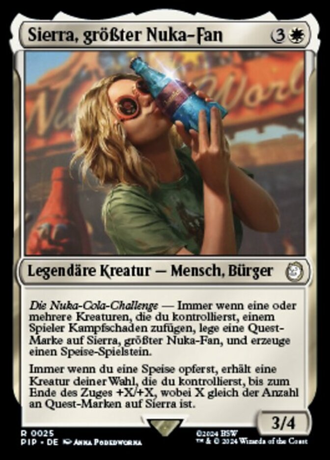 | Rules | The Nuka-Cola Challenge — Whenever one or more creatures you control deal combat damage to a player, put a quest counter on Sierra, Nuka's Biggest Fan and create a Food token. Whenever you sacrifice a Food, target creature you control gets +X/+X until end of turn, where X is the number of quest counters on Sierra. |