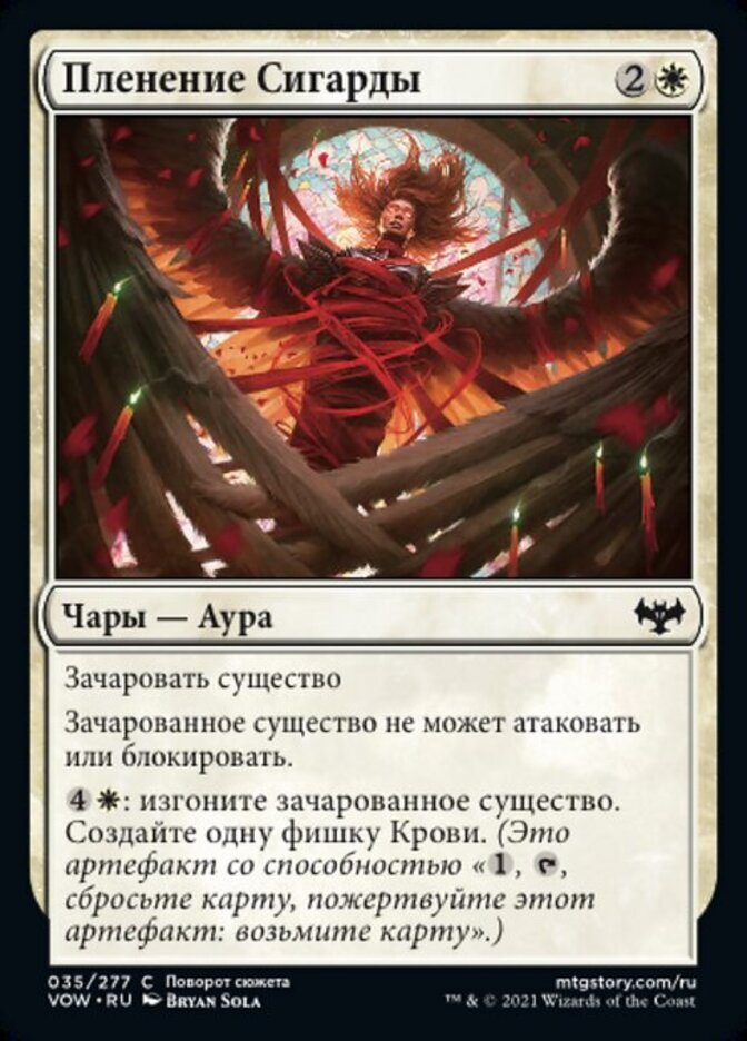 | Rules | Enchant creature Enchanted creature can't attack or block. : Exile enchanted creature. Create a Blood token. (It's an artifact with ", , Discard a card, Sacrifice this artifact: Draw a card.") |