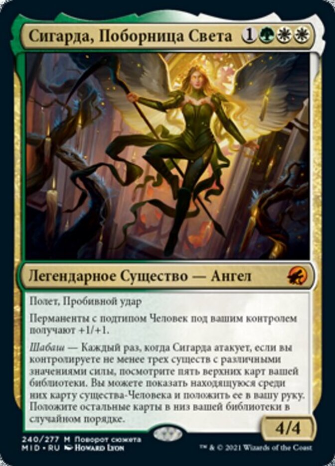 | Rules | Flying, trample Humans you control get +1/+1. Coven — Whenever Sigarda attacks, if you control three or more creatures with different powers, look at the top five cards of your library. You may reveal a Human creature card from among them and put it into your hand. Put the rest on the bottom of your library in a random order. |
