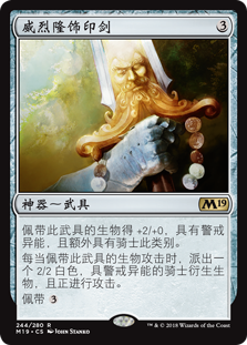 | Rules | Equipped creature gets +2/+0, has vigilance, and is a Knight in addition to its other types. Whenever equipped creature attacks, create a 2/2 white Knight creature token with vigilance that's attacking. Equip |