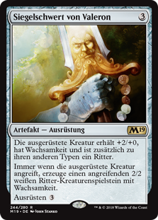 | Rules | Equipped creature gets +2/+0, has vigilance, and is a Knight in addition to its other types. Whenever equipped creature attacks, create a 2/2 white Knight creature token with vigilance that's attacking. Equip |