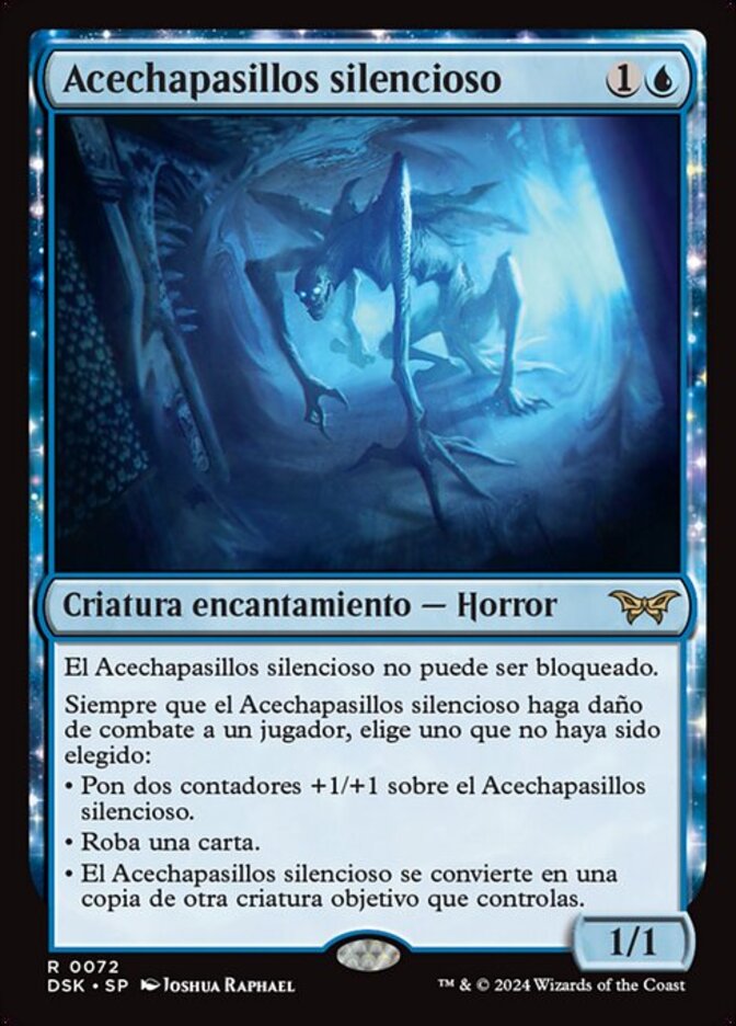 | Rules | Silent Hallcreeper can't be blocked. Whenever Silent Hallcreeper deals combat damage to a player, choose one that hasn't been chosen — • Put two +1/+1 counters on Silent Hallcreeper. • Draw a card. • Silent Hallcreeper becomes a copy of another target creature you control. |