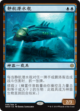 | Rules | Whenever Silent Submersible deals combat damage to a player or planeswalker, draw a card. Crew 2 (Tap any number of creatures you control with total power 2 or more: This Vehicle becomes an artifact creature until end of turn.) |