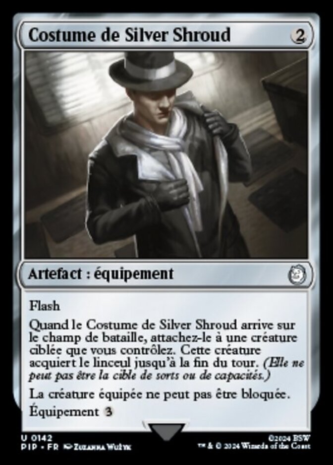| Rules | Flash When Silver Shroud Costume enters the battlefield, attach it to target creature you control. That creature gains shroud until end of turn. (It can't be the target of spells or abilities.) Equipped creature can't be blocked. Equip |