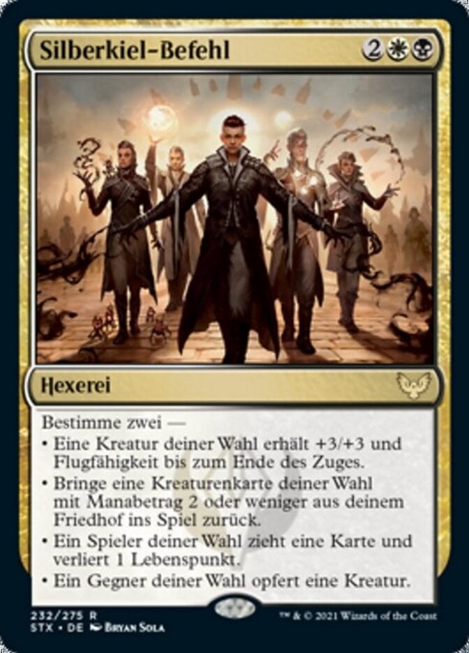 | Rules | Choose two — • Target creature gets +3/+3 and gains flying until end of turn. • Return target creature card with mana value 2 or less from your graveyard to the battlefield. • Target player draws a card and loses 1 life. • Target opponent sacrifices a creature. |