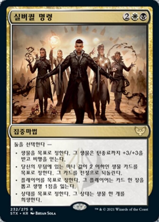 | Rules | Choose two — • Target creature gets +3/+3 and gains flying until end of turn. • Return target creature card with mana value 2 or less from your graveyard to the battlefield. • Target player draws a card and loses 1 life. • Target opponent sacrifices a creature. |