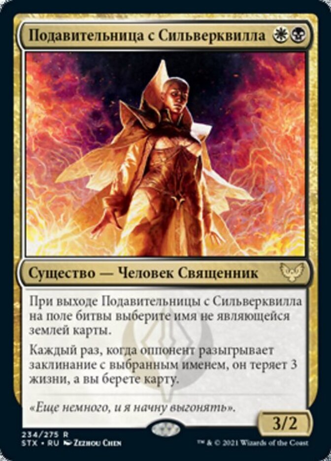 | Rules | As Silverquill Silencer enters the battlefield, choose a nonland card name. Whenever an opponent casts a spell with the chosen name, they lose 3 life and you draw a card. |