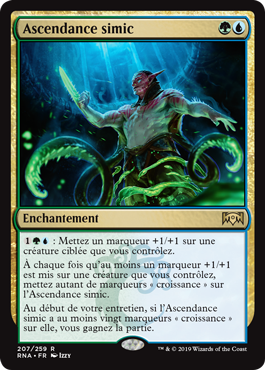 | Rules | : Put a +1/+1 counter on target creature you control. Whenever one or more +1/+1 counters are put on a creature you control, put that many growth counters on Simic Ascendancy. At the beginning of your upkeep, if Simic Ascendancy has twenty or more growth counters on it, you win the game. |