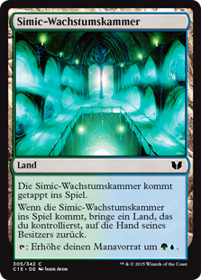 | Rules | Simic Growth Chamber enters the battlefield tapped. When Simic Growth Chamber enters the battlefield, return a land you control to its owner's hand. : Add . |