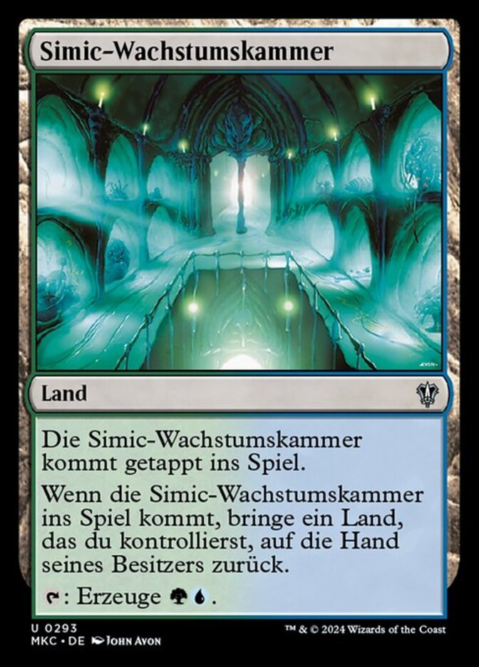 | Rules | Simic Growth Chamber enters the battlefield tapped. When Simic Growth Chamber enters the battlefield, return a land you control to its owner's hand. : Add . |