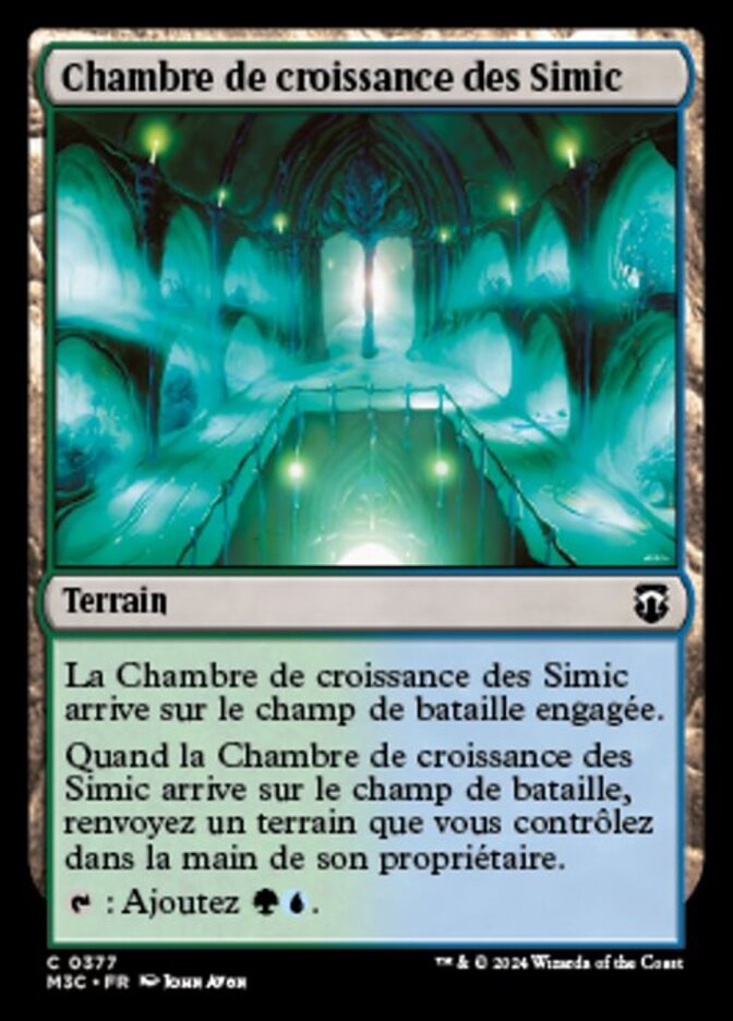 | Rules | Simic Growth Chamber enters the battlefield tapped. When Simic Growth Chamber enters the battlefield, return a land you control to its owner's hand. : Add . |