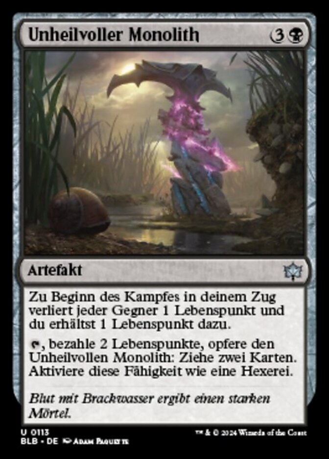 | Rules | At the beginning of combat on your turn, each opponent loses 1 life and you gain 1 life. , Pay 2 life, Sacrifice Sinister Monolith: Draw two cards. Activate only as a sorcery. |