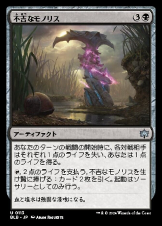 | Rules | At the beginning of combat on your turn, each opponent loses 1 life and you gain 1 life. , Pay 2 life, Sacrifice Sinister Monolith: Draw two cards. Activate only as a sorcery. |