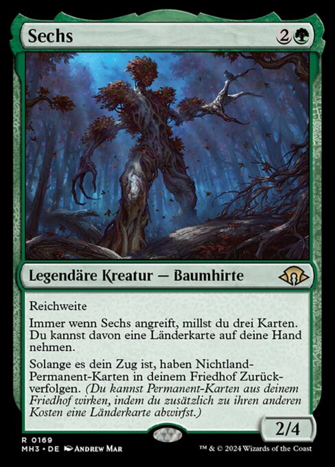 | Rules | Reach Whenever Six attacks, mill three cards. You may put a land card from among them into your hand. As long as it's your turn, nonland permanent cards in your graveyard have retrace. (You may cast permanent cards from your graveyard by discarding a land card in addition to paying their other costs.) |