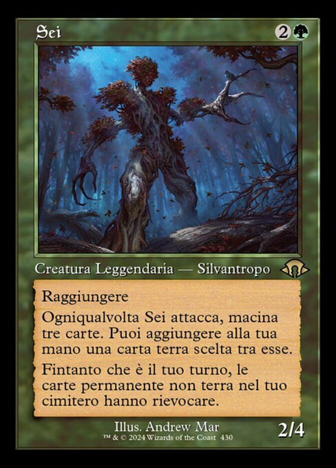 | Rules | Reach Whenever Six attacks, mill three cards. You may put a land card from among them into your hand. As long as it's your turn, nonland permanent cards in your graveyard have retrace. (You may cast permanent cards from your graveyard by discarding a land card in addition to paying their other costs.) |