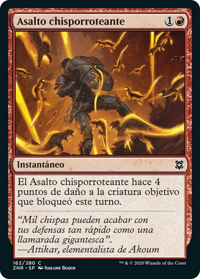 | Rules | Sizzling Barrage deals 4 damage to target creature that blocked this turn. |
