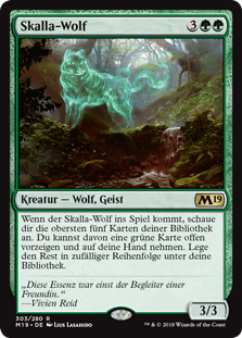 | Rules | When Skalla Wolf enters the battlefield, look at the top five cards of your library. You may reveal a green card from among them and put it into your hand. Put the rest on the bottom of your library in a random order. |