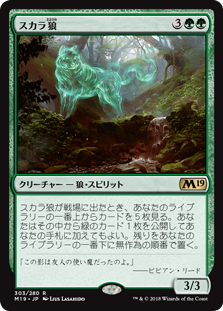 | Rules | When Skalla Wolf enters the battlefield, look at the top five cards of your library. You may reveal a green card from among them and put it into your hand. Put the rest on the bottom of your library in a random order. |
