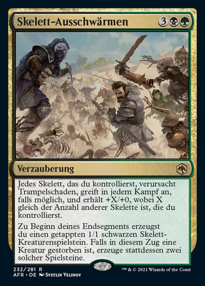 | Rules | Each Skeleton you control has trample, attacks each combat if able, and gets +X/+0, where X is the number of other Skeletons you control. At the beginning of your end step, create a tapped 1/1 black Skeleton creature token. If a creature died this turn, create two of those tokens instead. |