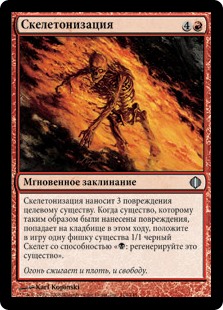 | Rules | Skeletonize deals 3 damage to target creature. When a creature dealt damage this way dies this turn, create a 1/1 black Skeleton creature token with ": Regenerate this creature." |