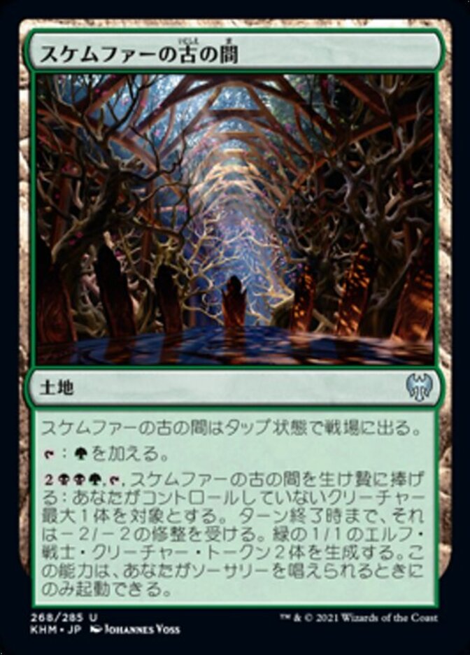 | Rules | Skemfar Elderhall enters the battlefield tapped. : Add . , , Sacrifice Skemfar Elderhall: Up to one target creature you don't control gets -2/-2 until end of turn. Create two 1/1 green Elf Warrior creature tokens. Activate only as a sorcery. |