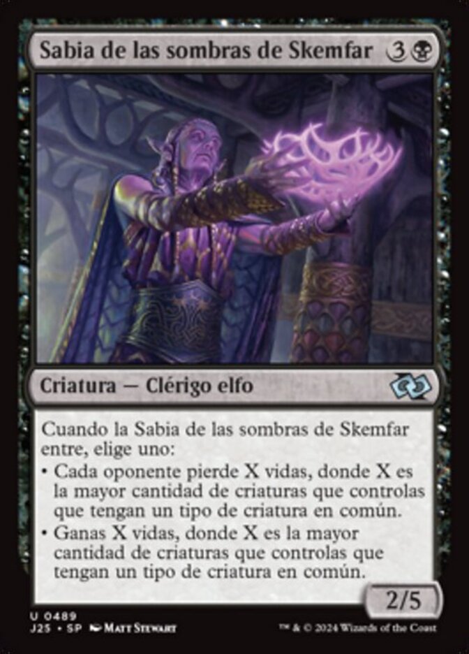 | Rules | When Skemfar Shadowsage enters the battlefield, choose one — • Each opponent loses X life, where X is the greatest number of creatures you control that have a creature type in common. • You gain X life, where X is the greatest number of creatures you control that have a creature type in common. |