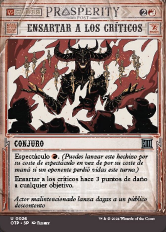 | Rules | Spectacle (You may cast this spell for its spectacle cost rather than its mana cost if an opponent lost life this turn.) Skewer the Critics deals 3 damage to any target. |