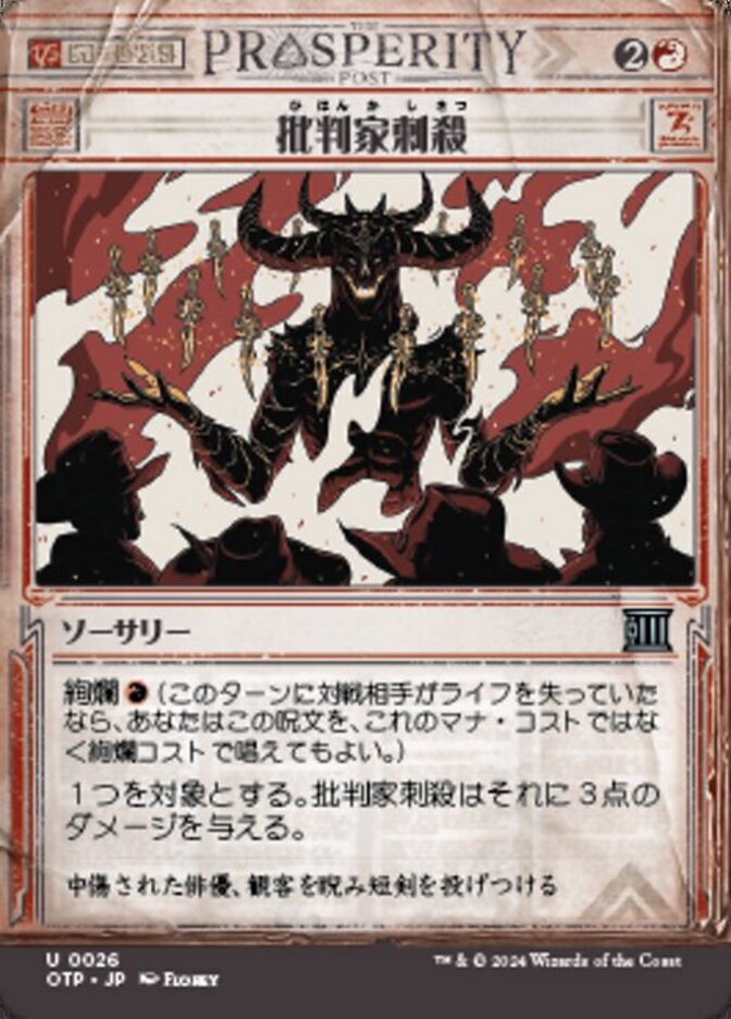| Rules | Spectacle (You may cast this spell for its spectacle cost rather than its mana cost if an opponent lost life this turn.) Skewer the Critics deals 3 damage to any target. |