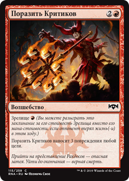 | Rules | Spectacle (You may cast this spell for its spectacle cost rather than its mana cost if an opponent lost life this turn.) Skewer the Critics deals 3 damage to any target. |