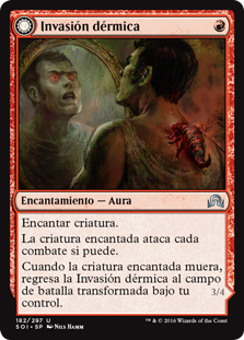 | Rules | Enchant creature Enchanted creature attacks each combat if able. When enchanted creature dies, return Skin Invasion to the battlefield transformed under your control. |