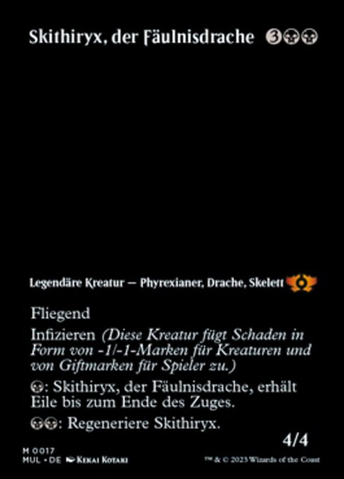 | Rules | Flying Infect (This creature deals damage to creatures in the form of -1/-1 counters and to players in the form of poison counters.) : Skithiryx, the Blight Dragon gains haste until end of turn. : Regenerate Skithiryx. |
