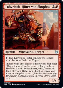 | Rules | : Skophos Maze-Warden gets +1/-1 until end of turn. Whenever another creature becomes the target of an ability of a land you control named Labyrinth of Skophos, you may have Skophos Maze-Warden fight that creature. (Each deals damage equal to its power to the other.) |